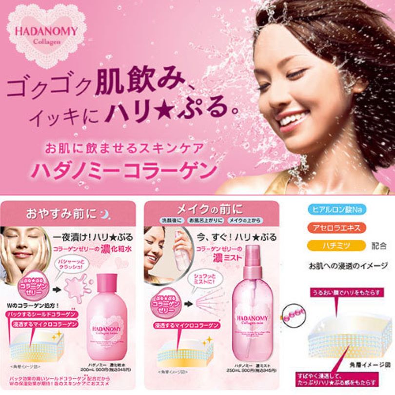 - Xịt khoáng collagen Hadanomy là một dòng mỹ phẩm cao cấp của Nhật bổ sung collagen cần thiết mang đến hiệu quả chăm sóc da vượt trội hơn hẳn các sản phẩm thông thường khác: